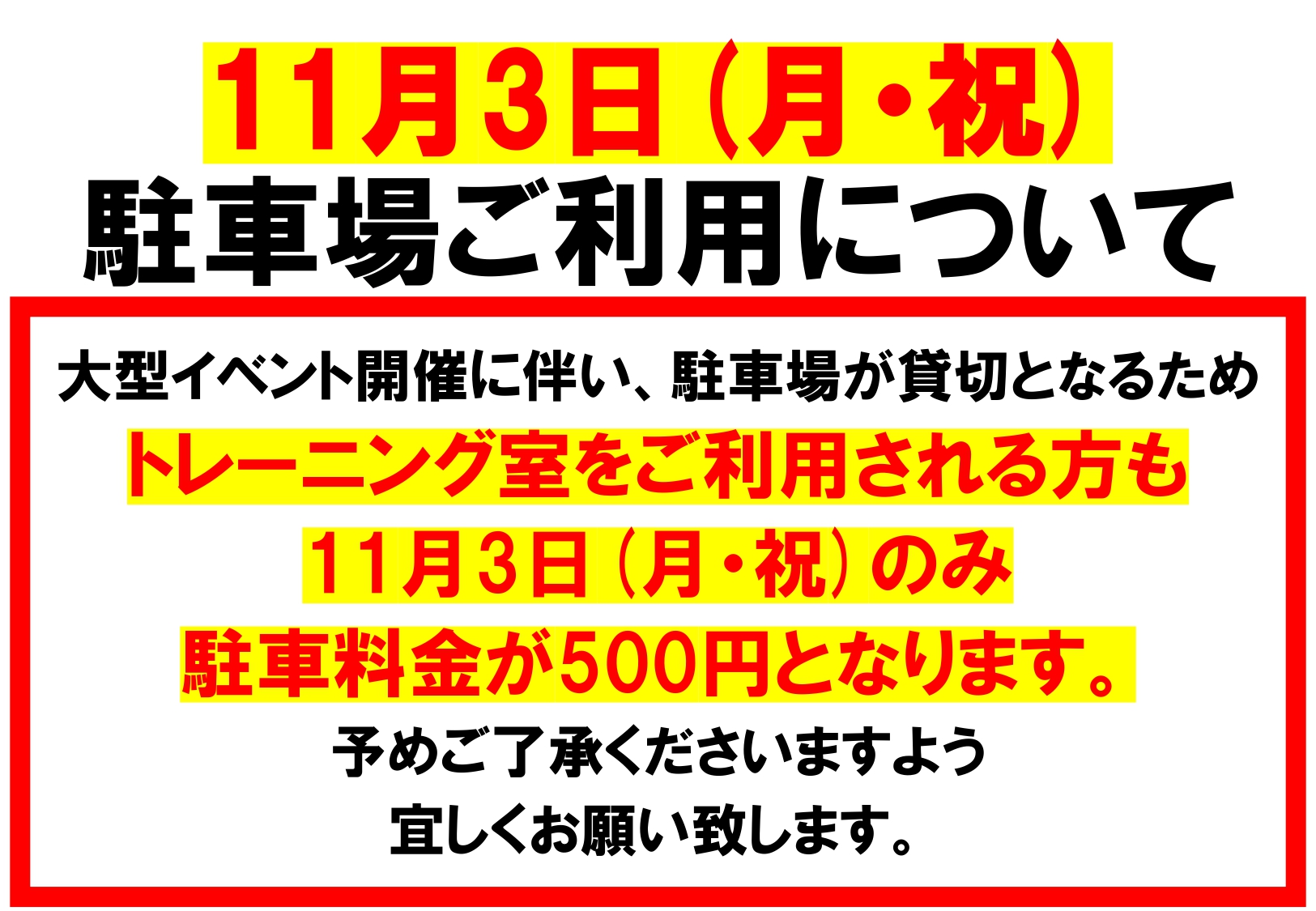 11月3日(月)に関しましては、駐車場貸切のため、トレーニング室をご利用される方も