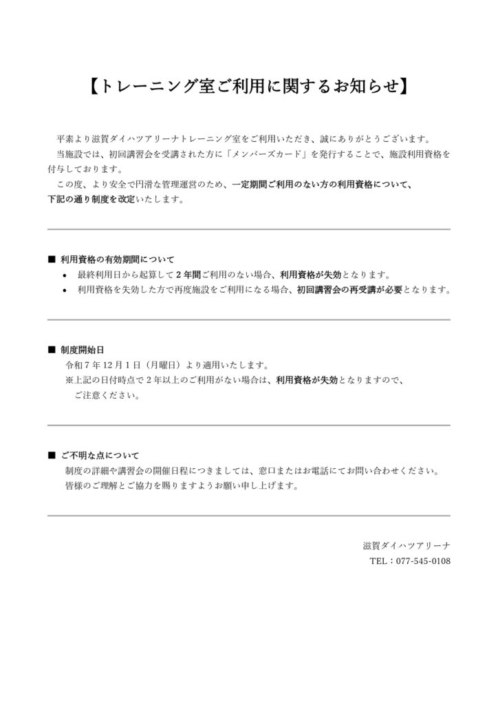 平素より滋賀ダイハツアリーナトレーニング室をご利用いただき、誠にありがとうございます。