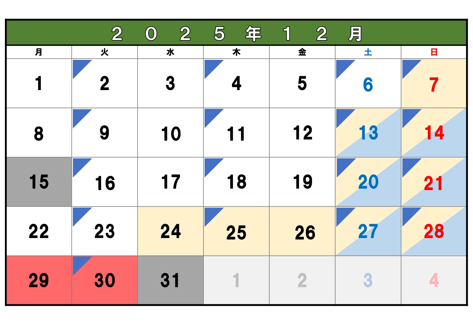 年末年始の休業は、2025年12月31日(水)~2026年1月2日(金)の3日間となります。