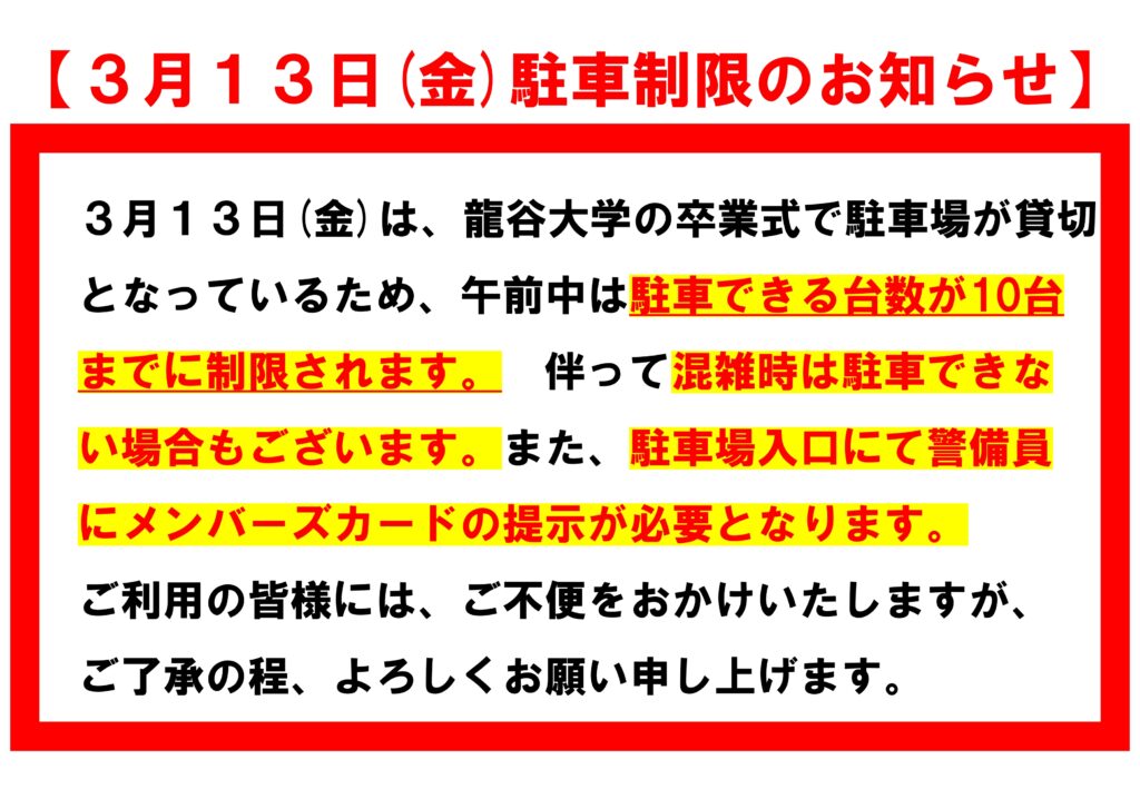 3月13日(金)は、龍谷大学の卒業式で駐車場が貸切となっているため、